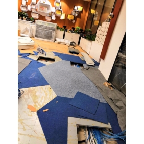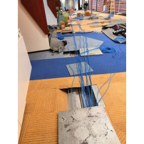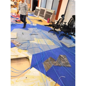 廣州越秀金融大廈某辦公室的原裝修設(shè)計(jì)線槽是走地面的,上面覆蓋防靜電地板,再鋪地氈的方式;對(duì)于網(wǎng)絡(luò)布線來說是相對(duì)比較好施工的一種了;首先按照?qǐng)D紙確定好點(diǎn)位,然后掀開地毯,(有一些地毯使用時(shí)間長(zhǎng)了比較難掀開,有損壞的在復(fù)原時(shí)重新訂購新的安裝好),然后用真空吸打開防靜電地板,找到弱電線槽并打開線槽蓋方便稍后布線作業(yè)。